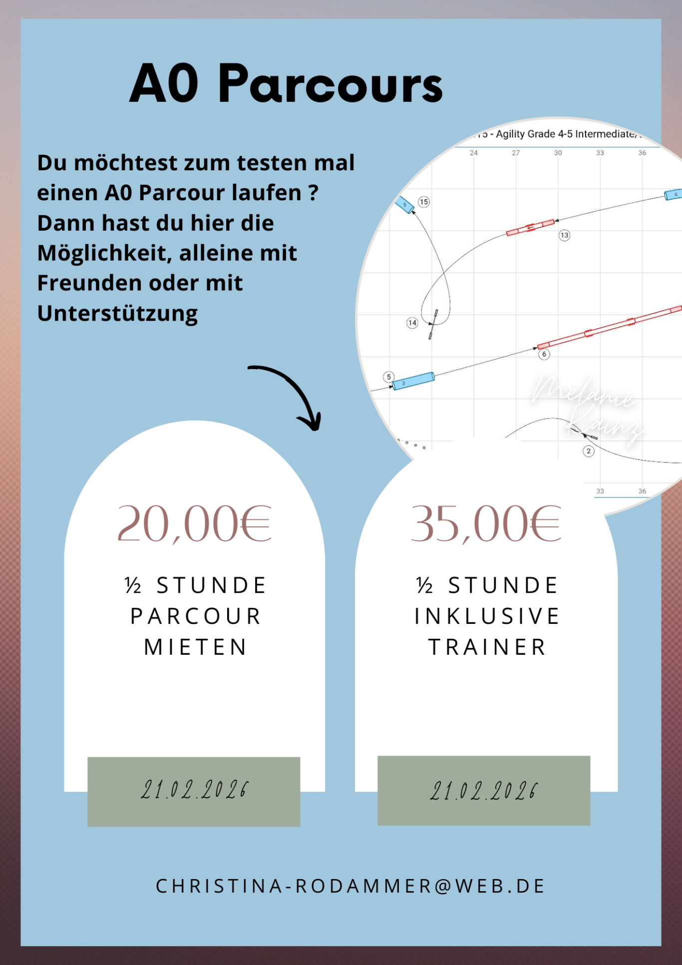 Wir stellen einen A0 Parcour, den ihr selbstständig erarbeiten / trainieren könnt. Auf Wunsch können Christina oder Britta Euch dabei umterstützen.